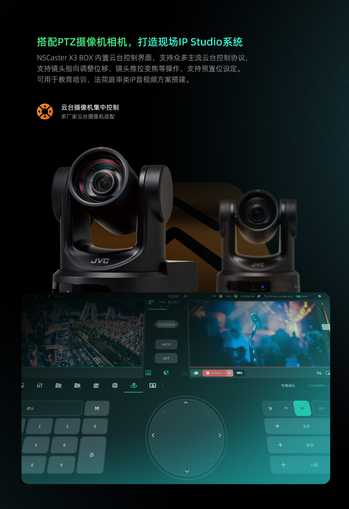 NSCaster X3 BOX 是一款嵌入式的12路直播工具,支持全高清制式节目制作并推流录制。设备支持SDI×4 + HDMI×2物理接口1080p60信号输入;支持众多主流格式流信号加载接入和LIVE+协议花火HQ聚合编解码器、纳加手机拍客APP等设备互动接入。